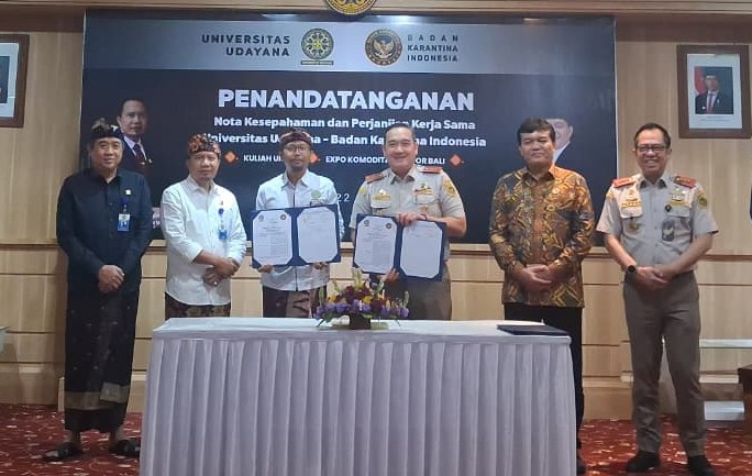 DENPASAR, BERITADEWATA – Badan Karantina Indonesia (Barantin) menggandeng Universitas Udayana (Unud) untuk memperkuat sinergi ilmu pengetahuan dan teknologi (IPTEK) di bidang karantina. Kerja sama tersebut ditandai dengan penandatanganan Nota Kesepahaman (NK) antara Kepala Barantin Sahat M Panggabean dan Rektor Unud Prof. I Ketut Sudarsana di Gedung Pascasarjana Kampus Sudirman Unud, Kamis (22/1/2026).