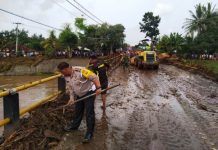 Denpasar - Hujan deras mengguyur Kabupaten Jembrana, Sabtu (22/12). Akibatnya Sungai Biluk Poh yang menjadi perbatasan antara Desa Penyaringan dengan Kelurahan Tegalcangkring terjadi banjir...