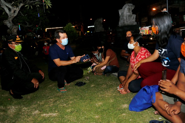 KLUNGKUNG, BeritaDewata – Bupati Klungkung I Nyoman Suwirta saat memantau keliling ketaatan masyarakat terhadap penggunaan protokol kesehatan (prokes) di areal Monumen Puputan Klungkung, pada Sabtu (19/9) Malam mengatakan sayangilah diri sendiri jangan takut sama petugas tetapi takutlah sama penyakit.