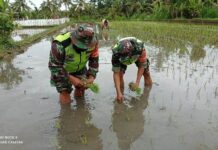 BANGLI, BeritaDewata - Upaya pemerintah dalam mendukung program ketahanan pangan khususnya swasembada pangan, Anggota Kodim 1626/Bangli turut serta melaksanakan pendampingan menanam padi.