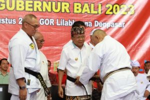 DENPASAR, BERITADEWATA – Gubernur Bali, Wayan Koster dianugerahi Sabuk Hitam oleh Institut Karate-Do Indonesia (INKAI) sebagai wujud tanda kehormatan INKAI kepada Murdaning Jagat Bali asal Desa Sembiran, Buleleng, atas jasanya di dalam mendukung kemajuan INKAI di Provinsi Bali.