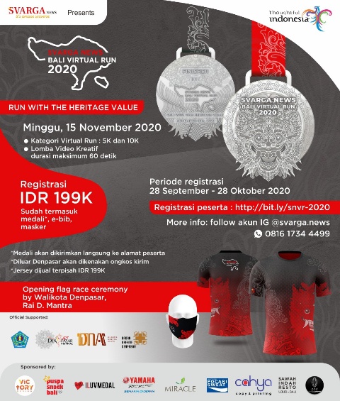 DENPASAR, Berita Dewata – Di tengah masa pandemi COVID-19 ini, menjaga kesehatan adalah penting. Salah satunya dengan berolahraga secara rutin. Lari merupakan olahraga yang banyak peminatnya, karena aman dan mudah dilakukan. Berdasarkan ketertarikan banyaknya orang berolahraga lari dan banyaknya manfaat yang didapat, maka dalam kesempatan kali ini tim EO Svarga News berinisiatif menggelar event bertajuk “Svarga News Bali Virtual Run 2020” yang akan diselenggarakan hari Minggu, 15 November 2020 mendatang.