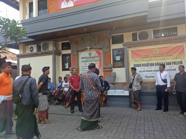 GIANYAR, BeritaDewata – Masyarakat beserta Prajuru Banjar Semu, Desa Singapadu kaler berbondong-bondong mendatangi kantor Kesbangpolinmas, Senin (30/12/2019), mereka datang untuk menyerahkan persoalan ini ke Pemerintah Kabupaten Gianyar.