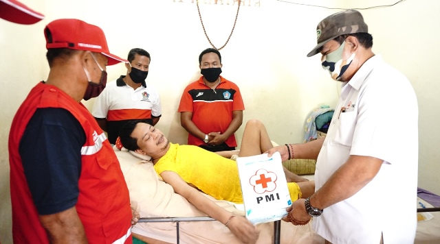Ketua PMI Cabang Klungkung yang juga Wakil Bupati Klungkung, I Made Kasta menyerahkan bantuan paket sembako kepada penderita lumpuh, I Ketut Sucitawan (36) di Dusun Pundukdawa, Desa Pesinggahan, Kecamatan Dawan, Jumat (26/6). Sucitawan menderita kelumpuhan sejak 9 tahun silam usai mengalami kecelakaan di jalan By Pas Ida Bagus Mantra, Klungkung.