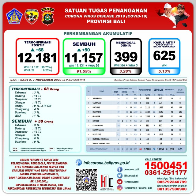 DENPASAR, BeritaDewata – Satuan Tugas Penanganan Covid 19 Provinsi Bali menyampaikan Perkembangan Pandemi Covid-19 per hari ini, Sabtu (7/11) mencatat pertambahan kasus Terkonfirmasi sebanyak 68 orang (65 orang melalui Transmisi Lokal 3 PPDN), Sembuh sebanyak 50 orang, dan Meninggal Dunia Nihil
